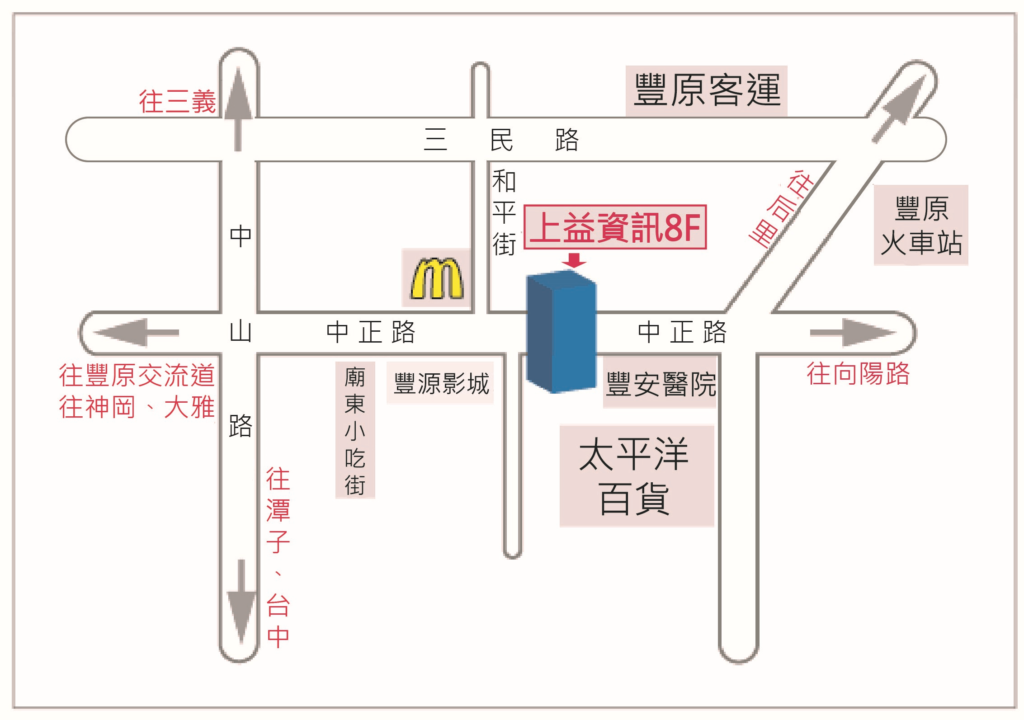 場地租借 電腦教室 會議小教室 租借方式 租借範圍: 租借場地之用途須符合「教育」之宗旨,並依本單位規定辦理。 租借方式: 先電洽本單位 04-25225596 陳小姐,同意本單位會租借條款之所載事項並付清費用後,與本單位安排租借時間即可完成租借程序。 勘查場地: 如需場勘,請提前聯絡本單位安排時間,勘查時間須於本單位服務時間:週一至週五 09:00~12:00 / 13:00~17:00;週六、日 10:00~12:00 / 13:00~16:00內進行。 變更時間: 若已安排租借時間欲更改,須提前 20 個工作日與本單位重新安排新的租借時間,但僅限變更一次。 取消租借: 如欲取消租借,請於租借時間前 20 個工作日通知本單位,已繳納之金額將全額退還,若未於規定時間內通知,費用概不退還。 聯絡我們 單位名稱:上益資訊管理顧問有限公司聯絡地址:台中市豐原區中正路127號8F服務時間:週一至週五 09:00~12:00 / 13:00~17:00;週六、日 10:00~12:00 / 13:00~16:00連絡電話:04-25225596 LINE 官方 ID: @mvq3345q客服信箱: [email protected]臉書粉絲專頁: https://www.facebook.com/sunyehfy/?locale=zh_TW 交通資訊 搭火車:豐原火車站 走路約5分鐘公車站牌:12崇德幹線、900號 媽祖廟 下車後走路約2分鐘停車資訊:豐原區葫蘆墩圳和平街停車場、博愛停車場、豐原-葫蘆墩圳停車場(站6)