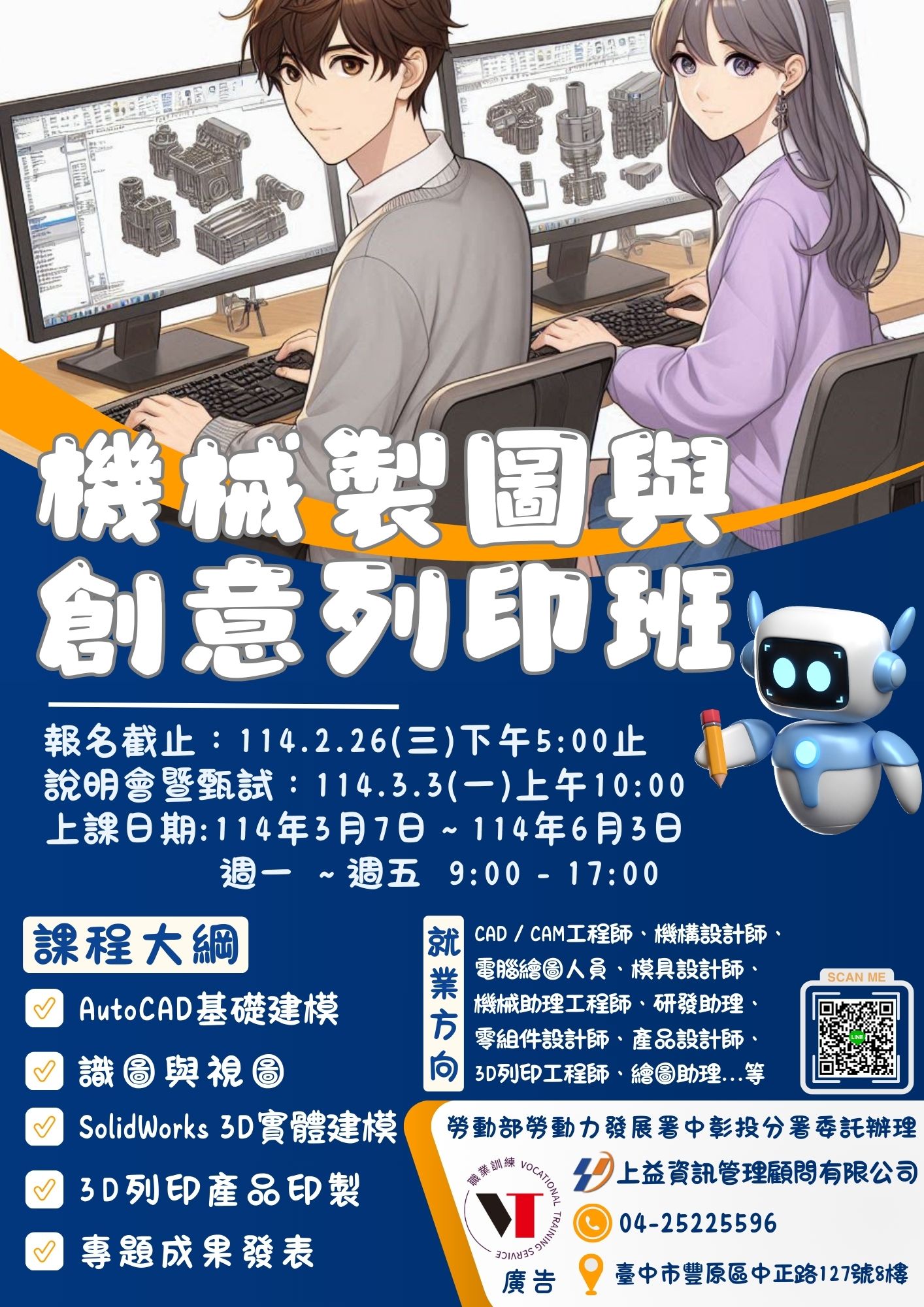 機械製圖與創意列印班/ 400小時 / 招訓人數30名