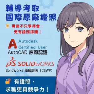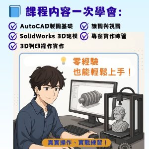 從 AutoCAD 製圖到 SolidWorks 3D建模,實作操作3D列印機,適合想學一技之長、轉職進入設計或製造業的你!結訓後可銜接原廠證照考試,助你更快踏上專業職涯。